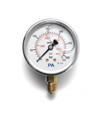 P300, 63mm, glycerine filled pressure gauge, PC lens, G1/4 LM connection with spigot, EN837-1, Kl. 1,6, 0-315 BAR/psi, PA logo Price: 7.40€ E-shop: E-shop Quantity * Add to cart